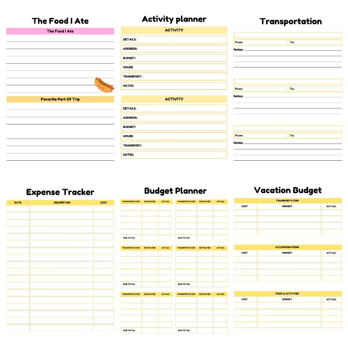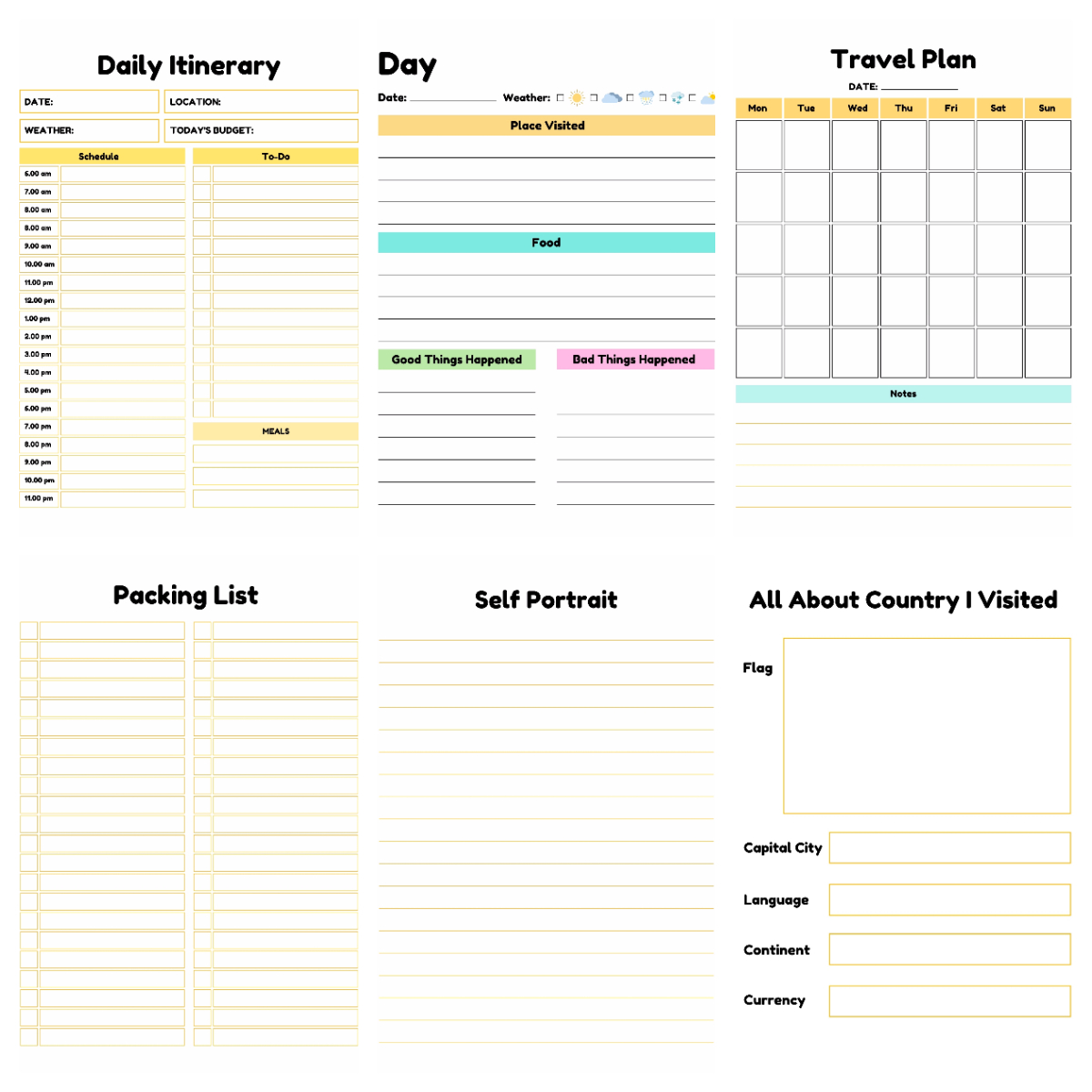 ✔ Daily travel log pages: