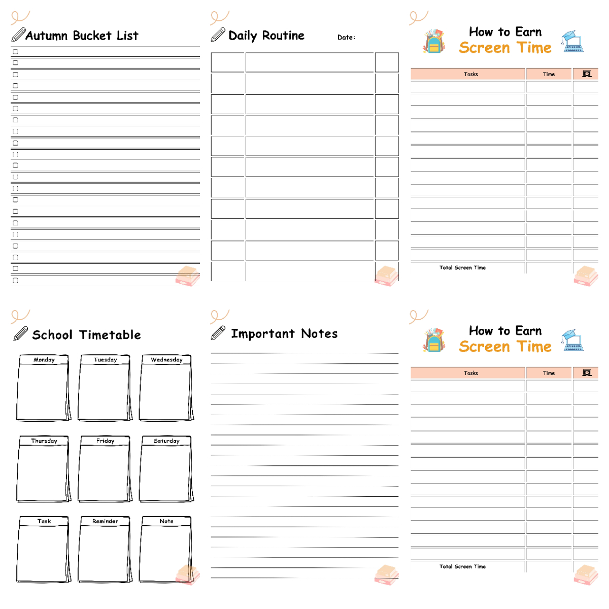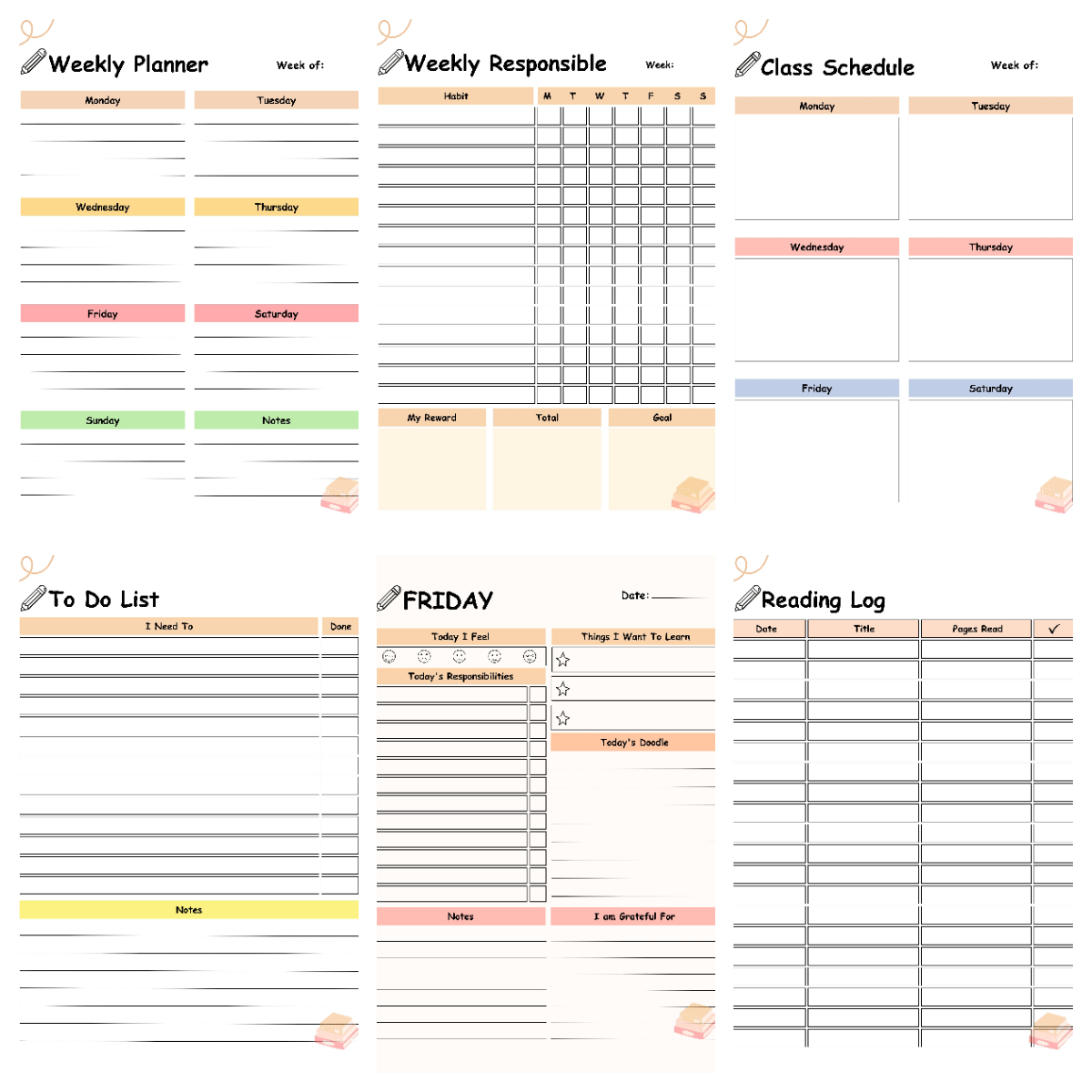 Inside, kids will find 33 engaging pages that include weekly schedules, homework trackers, reading logs, goal-setting sheets, chore lists, activity planners, and motivational prompts. Bright colors, kid-friendly layouts, and positive reminders keep students excited and on track throughout the school year.