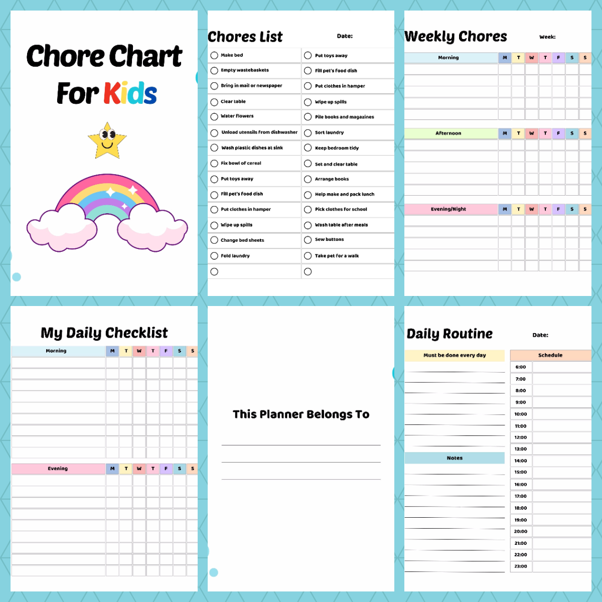 This printable set includes colorful, kid-friendly charts featuring cute icons, easy checklists, and daily/weekly tracking layouts that make chores feel fun and rewarding. Perfect for home, classrooms, and homeschooling environments.